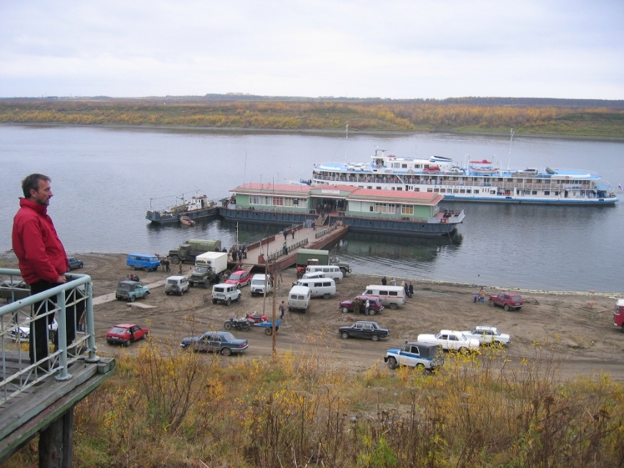 Wir haben uns kaum auf der Bank vor dem Museum niedergelassen, werden wir auch schon gefragt, ob wir einen Tee trinken wollen. Ludmilla vom Museum läd uns ein. Wir erfahren von ihr, dass Maria bereits 2-fache Großmutter ist und ihr Mann Alexander "soo einen Kopf" hat (sie hält beide Hände in Ohrhöhe neben den Kopf) sprich sehr intelligent ist. Das Permafrostmuseum feiert dieses Jahr den vierzigsten Geburtstag. Volker telefoniert mit Maria und bedankt sich auch im Namen von Lydia nochmals für Ihre Hilfe. Außerdem versucht er unsere Eile von vor fünf Tagen halbwegs zu rechtfertigen. Wir warten am Anleger auf unser Schiff. Um 15:00 Uhr packen wir den Kocher aus und kochen Kaffee. Bei Keksen, Wurst und Käse beobachten wir das Geschehen am Anleger von der etwa 15 Meter höher gelegenen Holzplattform aus. Viel tut sich nicht. Einige Autos und auch zwei LKW stehen am Ufer und Leute kommen und gehen. Auch um 17:00 Uhr ist das Bild nahezu unverändert. Ein Schlepper bugsiert einen Schwimmkran am Anleger vorbei. Kurz darauf macht ein kleiner Containerfrachter fest. Ab und zu fährt ein Motorboot vorbei. Die Leute scheinen das hier als Freizeitbeschäftigung anzusehen. Man trifft sich am Sonntag am Anleger und nicht erst eine, sondern 5 bis 6 Stunden bevor das Schiff kommt. Volker meint, die wissen ganz genau wann das Schiff ankommt ich glaube eher die wollen es gar nicht wissen. |