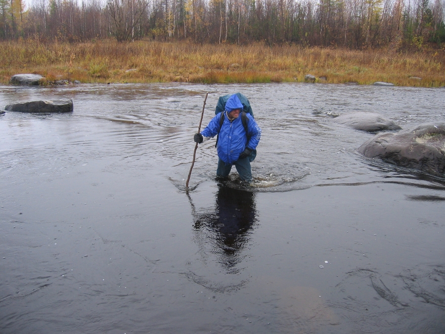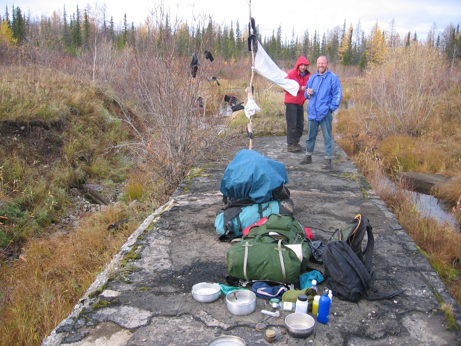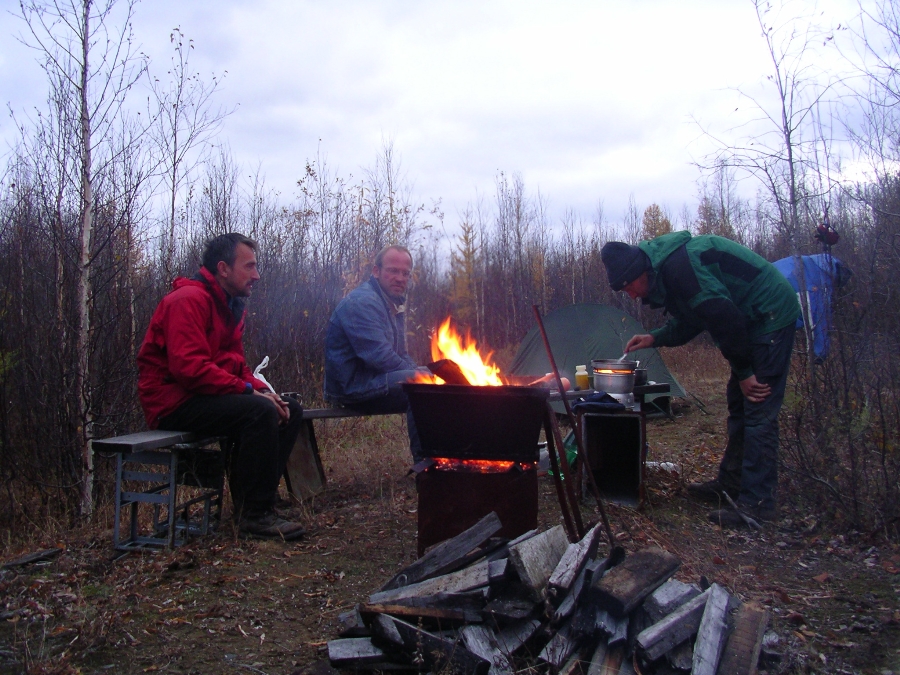 gegen den Matsch Polarlicht und angesengte Schuhe Es ist noch dunkel! Mein Hals ist staubtrocken und es schmerzt beim Schlucken. Vielleicht vom Rauch gestern Abend? Jedenfalls brauche ich jetzt ein Halsbonbon. Ich habe den Reißverschluß des Schlafsacks schon in der Hand, da höre ich ein kurzes Plick kurz darauf noch ein Plick. Ich lausche weiter und es macht Plick Plick Plick! Vögel? Nein kann nicht sein, wir haben bisher nur wenige gesehen nur ab und zu ein Moorhuhn und einen Auerhahn; und bei einem Auerhahn würde es sicher nicht nur Plick machen. Die Sache ist eindeutig: Es beginnt zu regnen! Reißverschluß auf und Schuhe rein ist mein erster Gedanke dann noch ein Hustenbonbon und zurück in den Schlafsack. Ich glaube die Jungs haben noch gar nichts mitbekommen. Gegen 08:00 Uhr regnet es immer noch. Es hilft nichts, wir müssen raus. Die Plastikplane unter dem Zelt steht zu weit über und hat unsere Liegekule vollaufen lassen. Die Thermomatten sind klatschnass die Schlafsäcke sind noch glimpflich davongekommen. Jürgen und Volker bauen einen Unterstand um darunter Tee zu kochen. Ich verstaue derweil die nassen Matten und die Schlafsäcke. Das dauert alles seine Zeit. Um halb elf regnet es immer noch. Wir entscheiden uns dem Tipp des Jägers zu folgen und die Hütte am Schwarzen Fluss zu suchen. Das bedeutet wir kehren um. Der Matsch der Panzerstraße, der gestern noch so schön gefroren war, hat sich nun in eine glitschige, tiefe Pampe verwandelt Vorsicht ist angesagt. Als ich kurze Zeit später vom Rand auf die Straße springe, versinke ich bis zum Knie im Morast, verliere noch dazu das Gleichgewicht und kippe auf die Seite. Jürgen kommentiert nur lapidar: "Super Norres, Photo?"